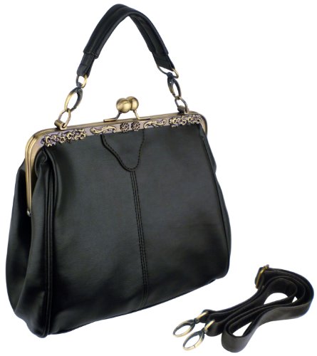 This classic satchel purse captures the season's ladylike look in soft leatherette with an antique kiss clasp closure. With ample space and 3 ways to carry, this design is tailor made for the lady on the go who wants to try the handheld style but can't live without room for all her necessities. Retro frame with floral details adds vintage-like hardware for a mixture of old and new. Fully lined interior is equipped with zippered back wall closure and 2 open flap pockets to organize your cell phone, makeup, and other necessities. Simply detach the handle and covert to evening clutch bag, or attach the adjustable long strap to carry this handbag on the shoulder when needed. With a chic modern touch this classic frame shoulder bag is the essence of vintage cool.