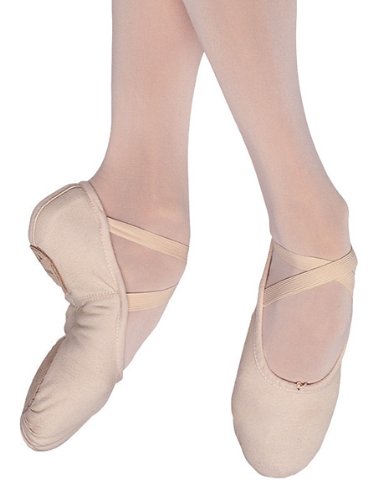 Bloch's child "Pump" split-sole canvas ballet slipper has a heel seam cushion and a breakthrough technique reducing underfoot lumps. Crisscross elastics attached at heel.