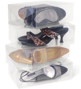 These unique shoe organizers are designed to change the way you think of about shoe boxes. Unlike traditional boxes, these clear shoe storage boxes don't have lids! They open from the front and back, and you can simply pack them flat to store them away in the included custom fitted clear storage bag. Each clear shoebox holds a pair of women's shoes up to a size 10, and is the ideal closet organization solution for anyone with a raging shoe collection or unruly closet! Made from durable polypropylene, the space-saving, stackable, clear shoeboxes are ventilated and mold resistant. Perfect for protecting your shoes when they are not on your feet! The organizer boxes are also great for storing fashion accessories like handbags, belts and scarves. Sold in a set of 10 boxes. Assembly level/degree of difficulty: Easy.