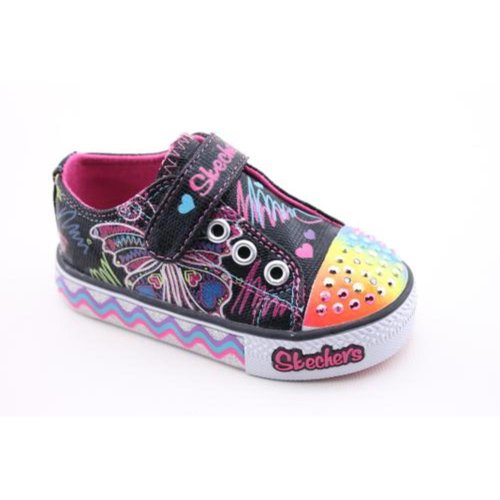 Sneak a peak at her sparkling charm and delightful nature in the Twinkle Toes - Peekaboo shoes from Skechers. These pretty slip-ons feature a soft canvas fabric upper in a laceless design with glitter detail, fun print graphic accents, and a rhinestone embellished rubber cap toe. The soft fabric shoe lining provides all day comfort. Midsole is vulcanized for shock absorption while the rubber outsole is durable, flexible, and offers excellent traction.